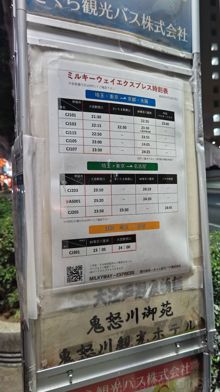 停車地は大宮駅西口、さいたま新都心バスターミナル、東京駅鍛冶橋駐車場となっており、その先は関西まで直行し阪急高速バス大阪梅田ターミナル、難波OCAT(湊町バスターミナル)に停車します。