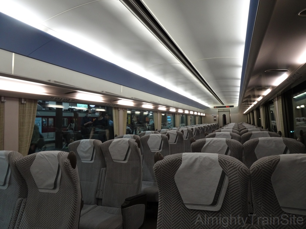 座席は22000系より広い1050mmのシートピッチで、リクライニングに連動して座面が沈み込む「ゆりかご式リクライニングシート」を採用しています。
