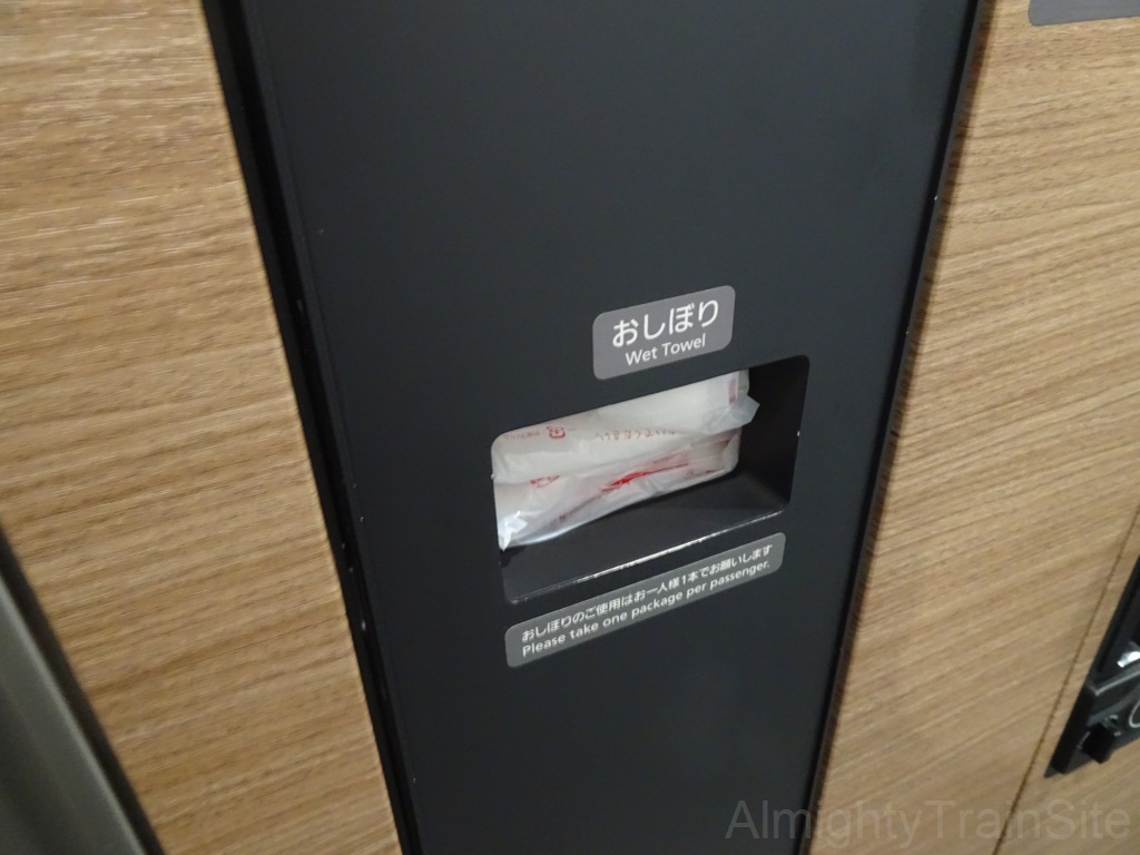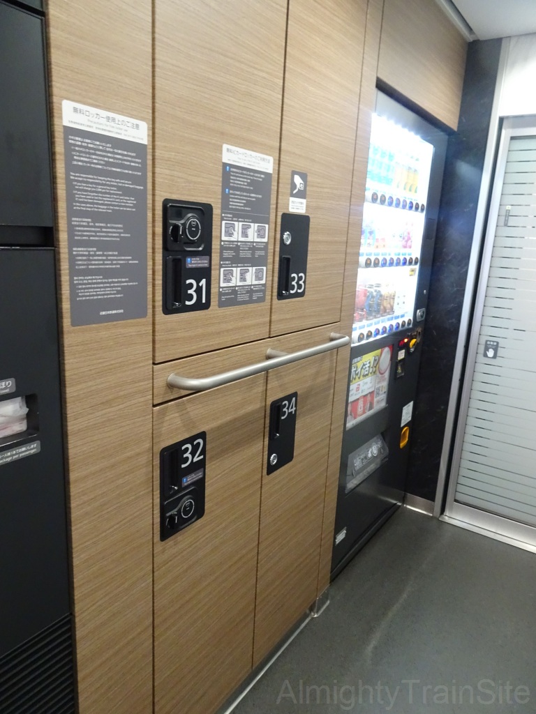 その他の設備として、大型荷物用のロッカーをデッキに備えている他、プレミアムシートのデッキ部には引き立てのホットコーヒーや紅茶・ココア・スープ、お菓子や「ひのとり」グッズを扱う自動販売機を、3号車には飲料のjぢ王販売機を、2・5・7号車にはベンチスペースを設けており、無料Wi-FiサービスやAED、防犯カメラなども備えます。